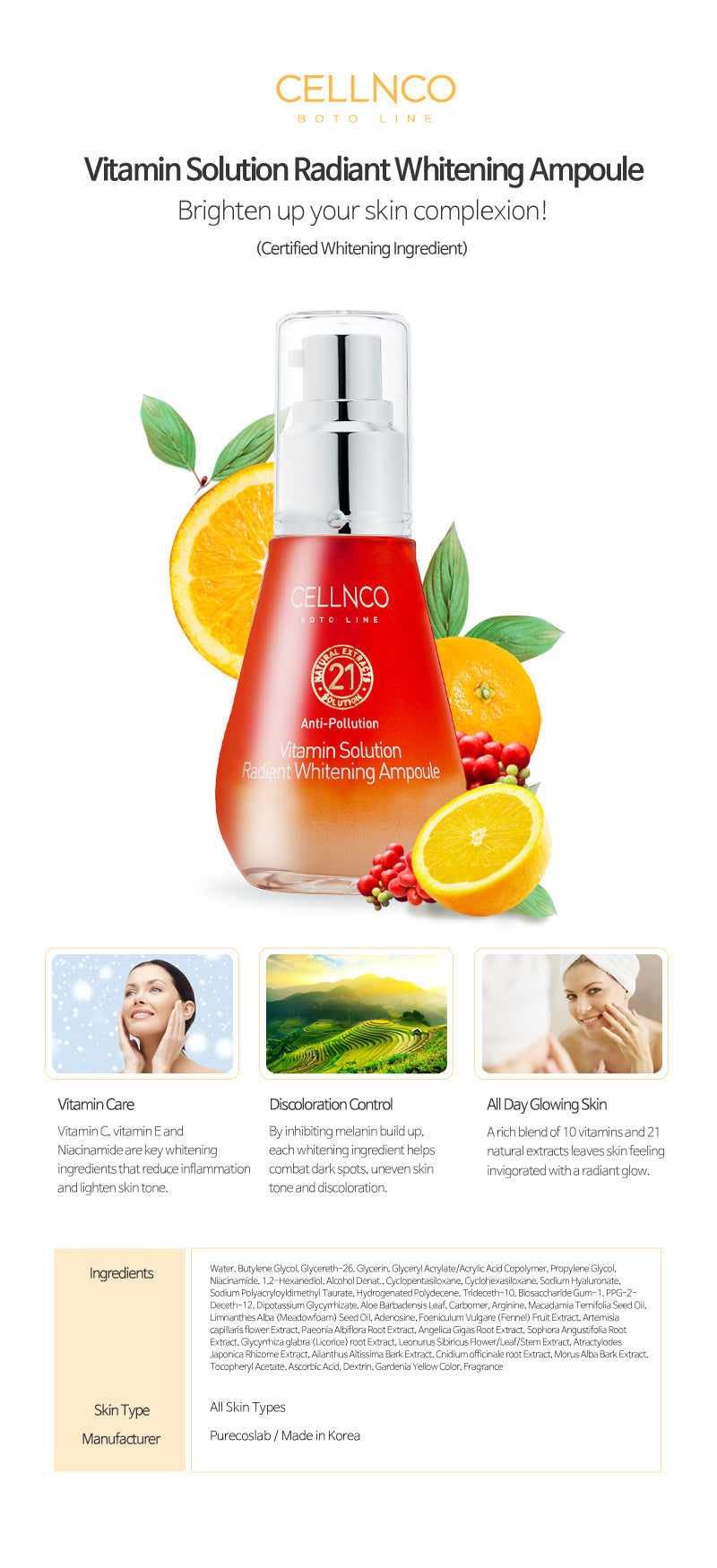 Después de realizar la doble limpieza, aplique el tónico y luego esta ampolla de vitamina C, VITAMIN SOLUTION RADIANT WHITENING AMPOULE. Masajear suavemente dando palmaditas a la piel para una rápida absorción.